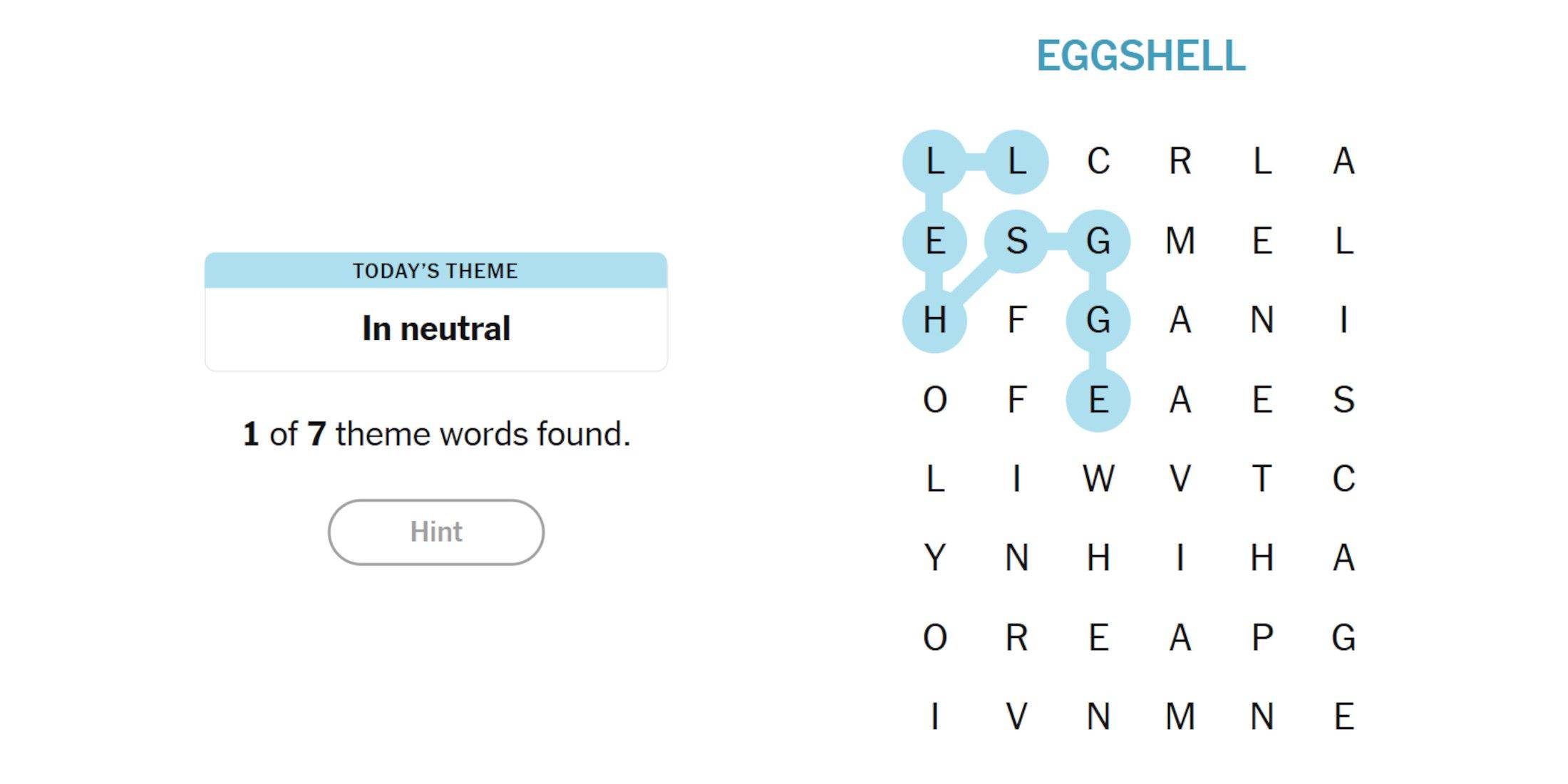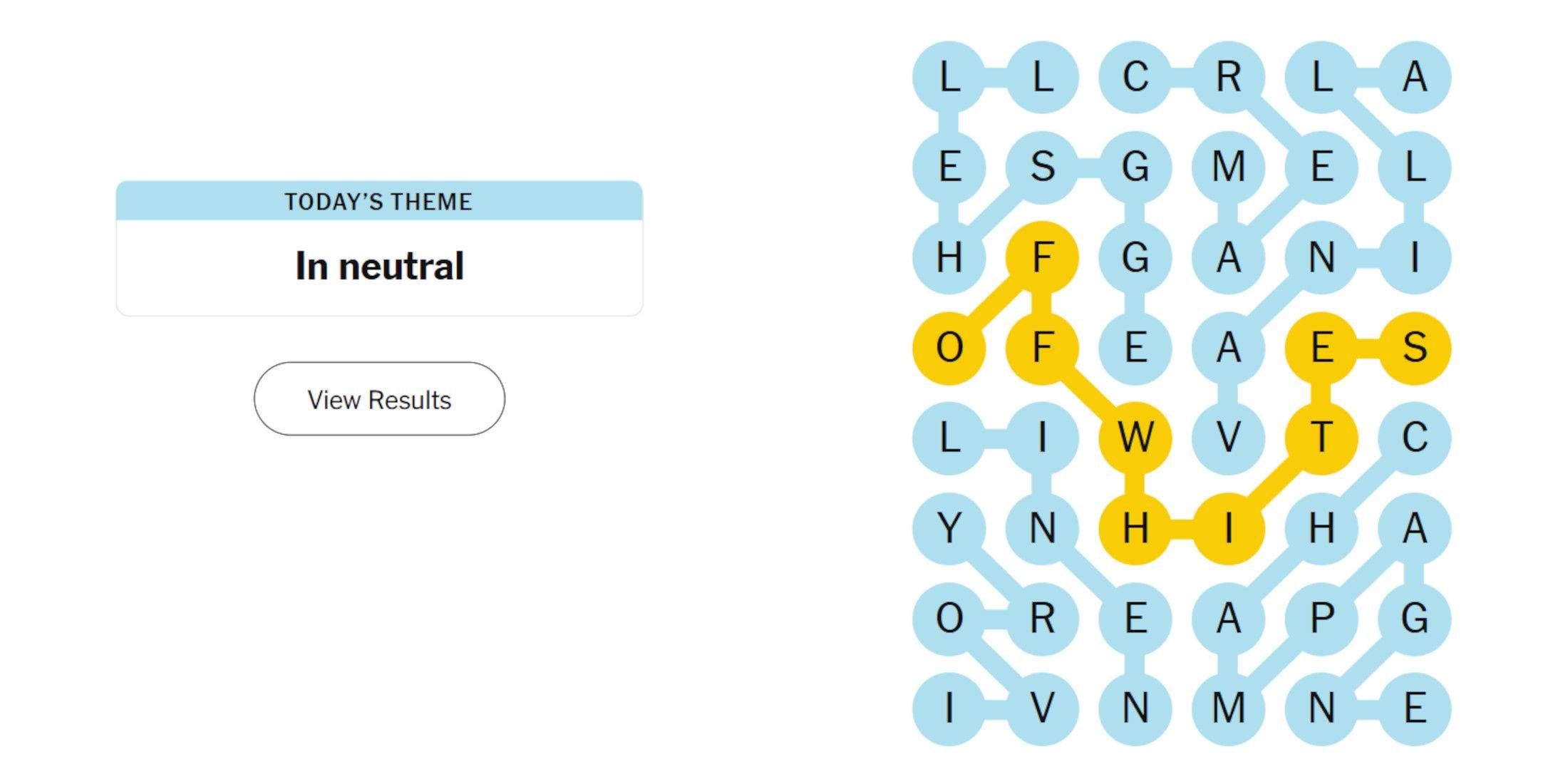 Today's Strands puzzle features the clue "In Neutral." Seven words are to be found: a pangram and six thematically related words.