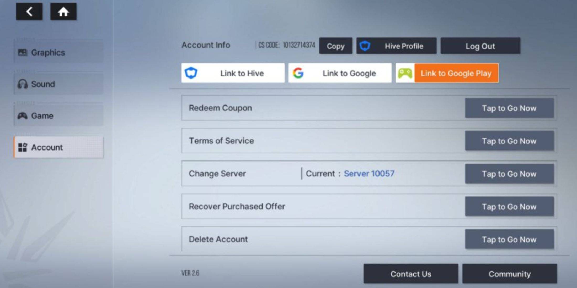 - Enter your Player CS Code (found in the in-game Account tab).